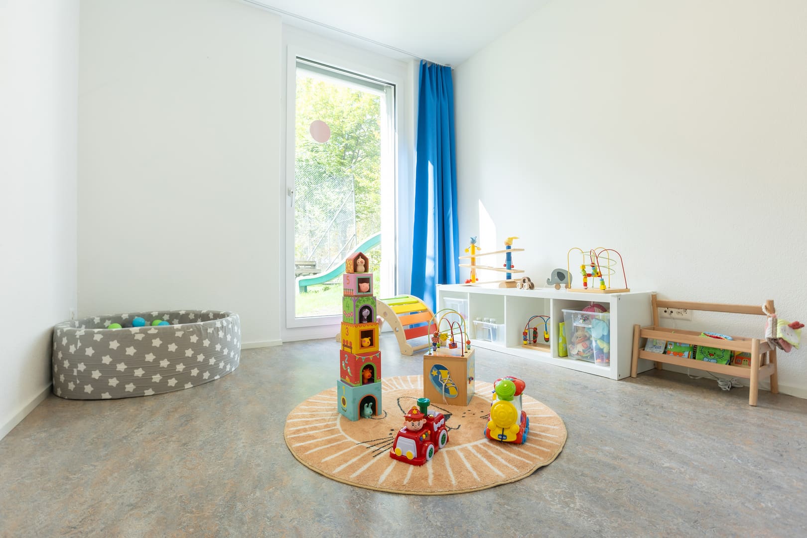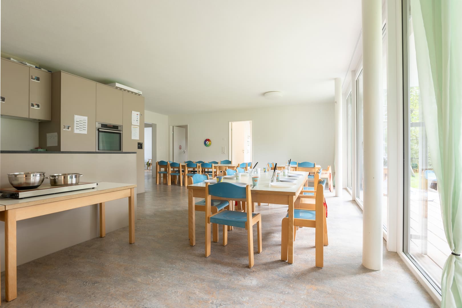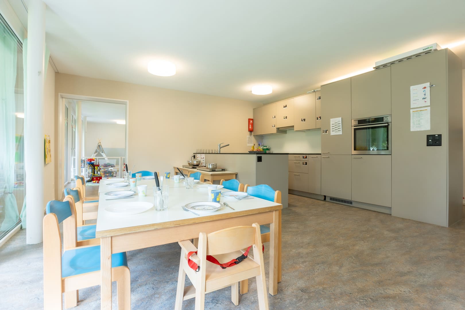Tanto spazio per scoprire: Il nostro asilo nido può ospitare fino a 26 bambini, ha un giardino e un'area boschiva. Due volte al mese possiamo utilizzare la palestra della scuola. Ogni giorno, la nostra cucina centrale Fiorino Tavola elabora menu equilibrati per bambini a base di ingredienti freschi e regionali.
