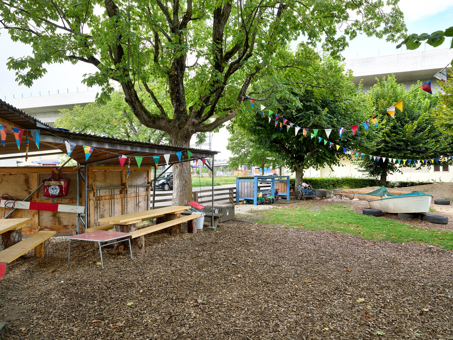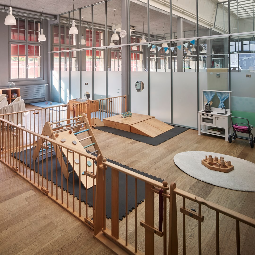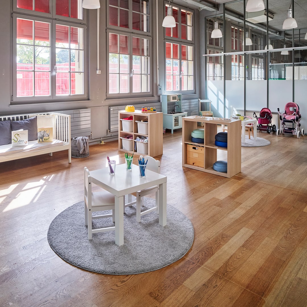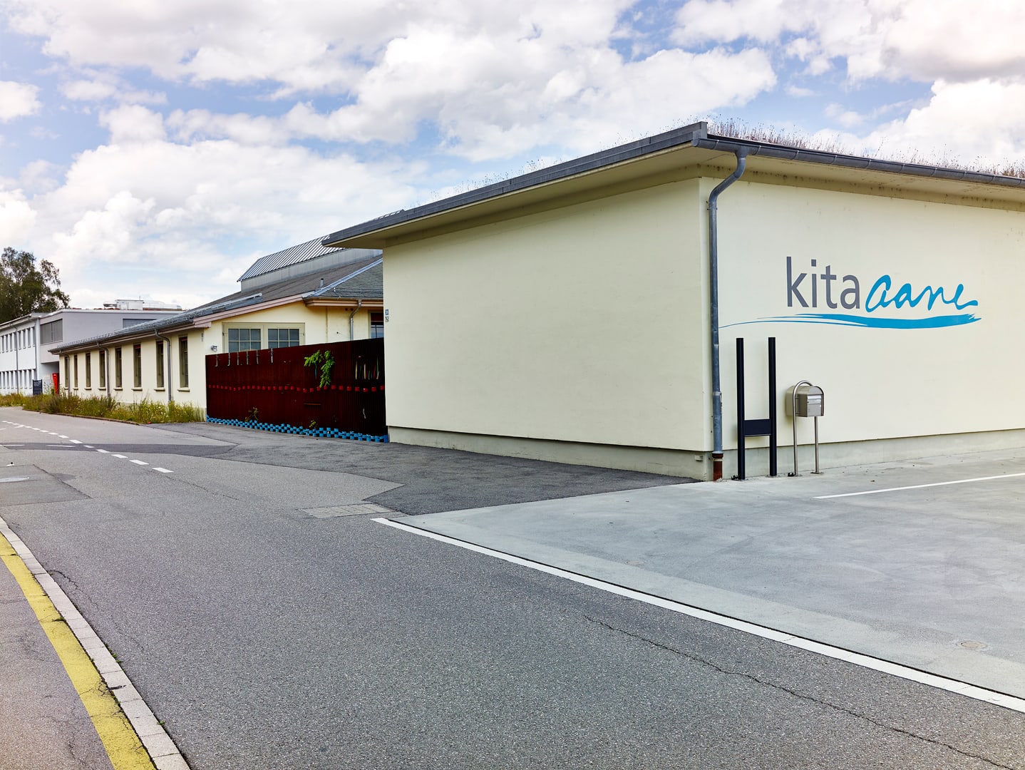 L'edificio dell'ex fabbrica Ruag si trova in una posizione tranquilla nel parco industriale di Thun, vicino al centro città, ed è stato convertito nel 2009 per renderlo adatto ai bambini e agli asili nido. Lo spazio luminoso, simile a un loft, è diviso da pareti trasparenti in modo che tutti e quattro i gruppi abbiano il proprio rifugio. C'è un angolo sperimentale, una sbarra a muro e speciali elementi di movimento come una tavola oscillante. L'asilo ha ottenuto il marchio Qualikita. Una sabbiera e tante macchine e biciclette aspettano di essere utilizzate nel piazzale riparato. Tuttavia, il punto forte dell'asilo Aare è il vicino parco giochi per bambini. Due volte alla settimana, il gruppo di esperienze naturalistiche di Aare Bibere trascorre qui le sue giornate, cucinando il proprio pranzo sul fuoco. L'area naturale incontaminata con un prato, una barca, una carrozza e tanto legno per costruire è un paradiso per i bambini curiosi.