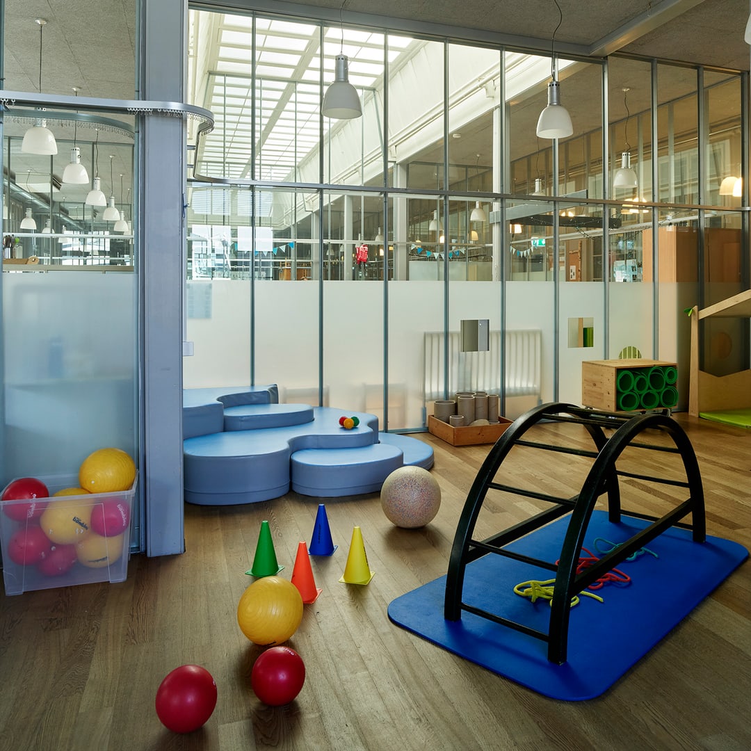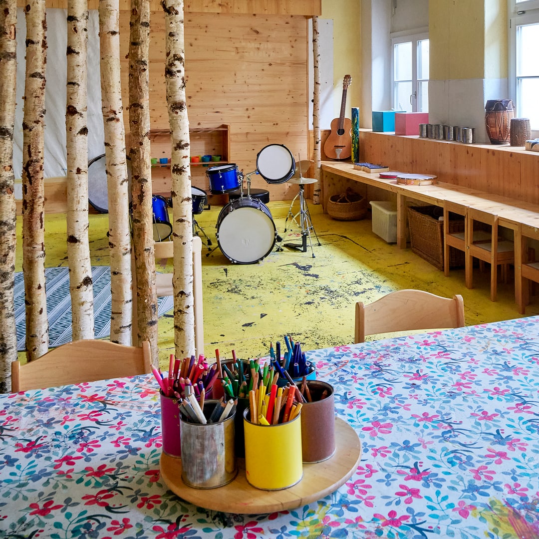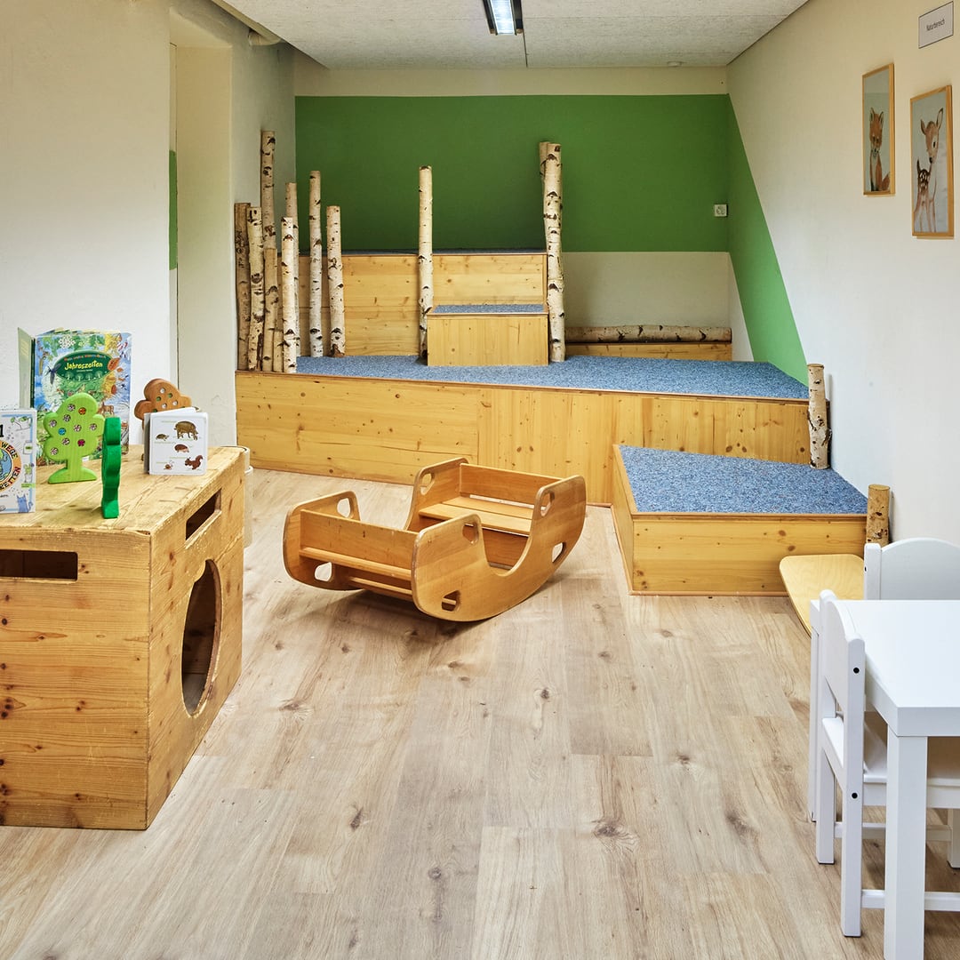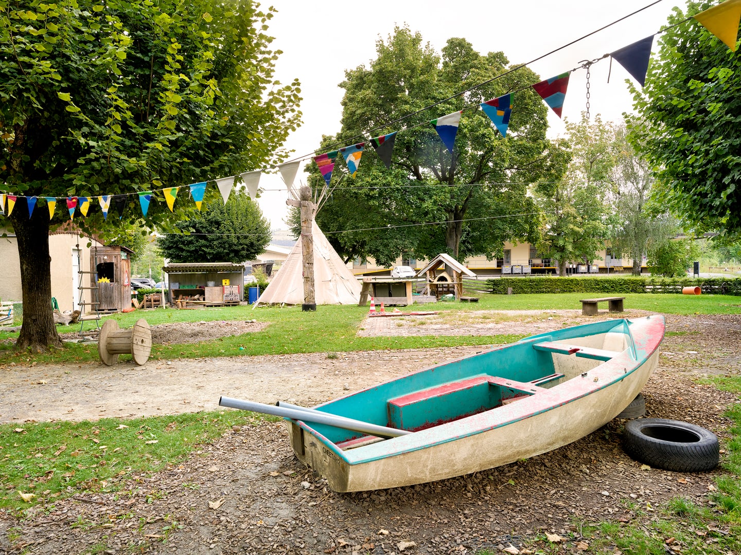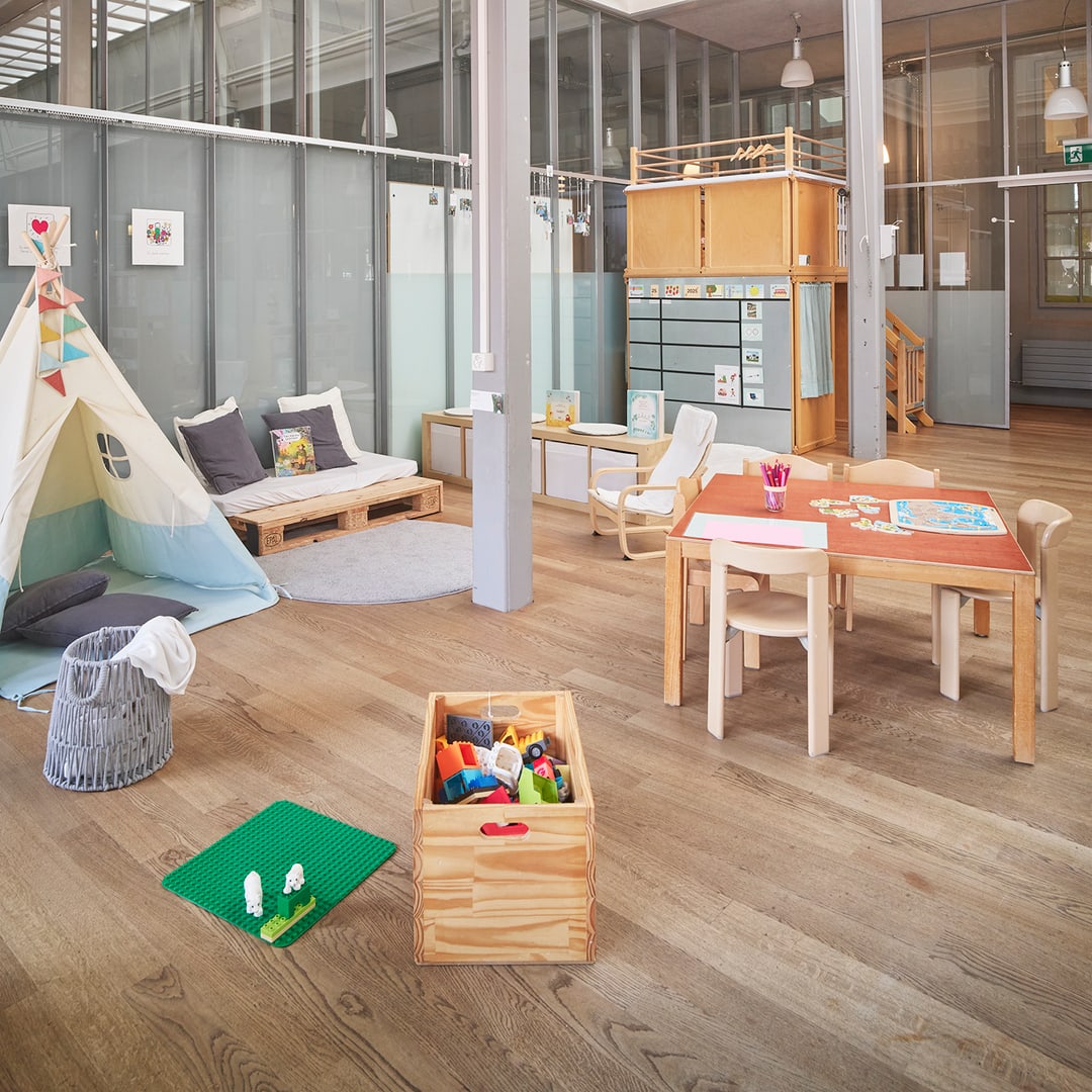 L'edificio dell'ex fabbrica Ruag si trova in una posizione tranquilla nel parco industriale di Thun, vicino al centro città, ed è stato convertito nel 2009 per renderlo adatto ai bambini e agli asili nido. Lo spazio luminoso, simile a un loft, è diviso da pareti trasparenti in modo che tutti e quattro i gruppi abbiano il proprio rifugio. C'è un angolo sperimentale, una sbarra a muro e speciali elementi di movimento come una tavola oscillante. L'asilo ha ottenuto il marchio Qualikita. Una sabbiera e tante macchine e biciclette aspettano di essere utilizzate nel piazzale riparato. Tuttavia, il punto forte dell'asilo Aare è il vicino parco giochi per bambini. Due volte alla settimana, il gruppo di esperienze naturalistiche di Aare Bibere trascorre qui le sue giornate, cucinando il proprio pranzo sul fuoco. L'area naturale incontaminata con un prato, una barca, una carrozza e tanto legno per costruire è un paradiso per i bambini curiosi.