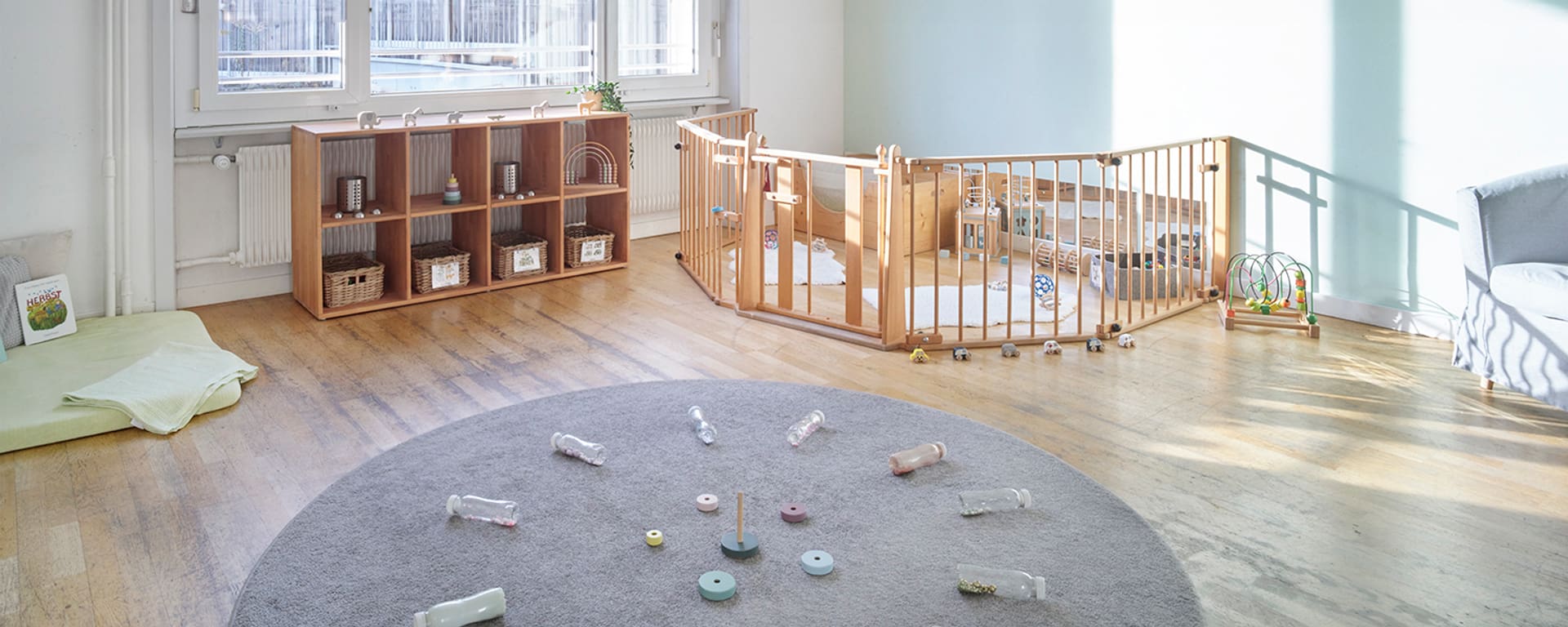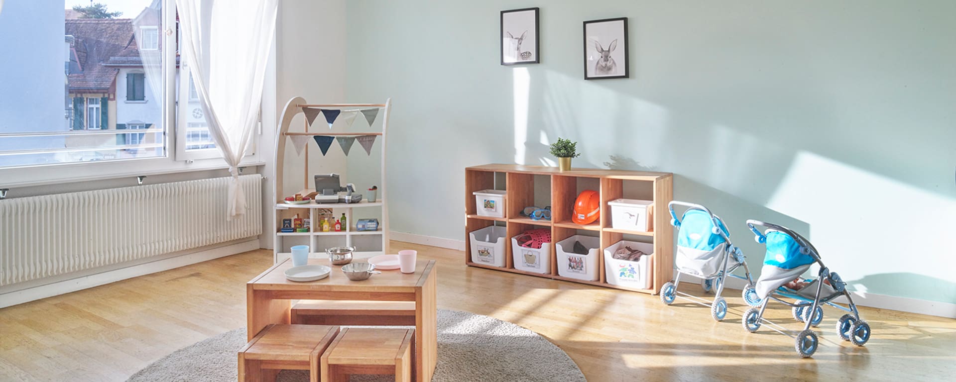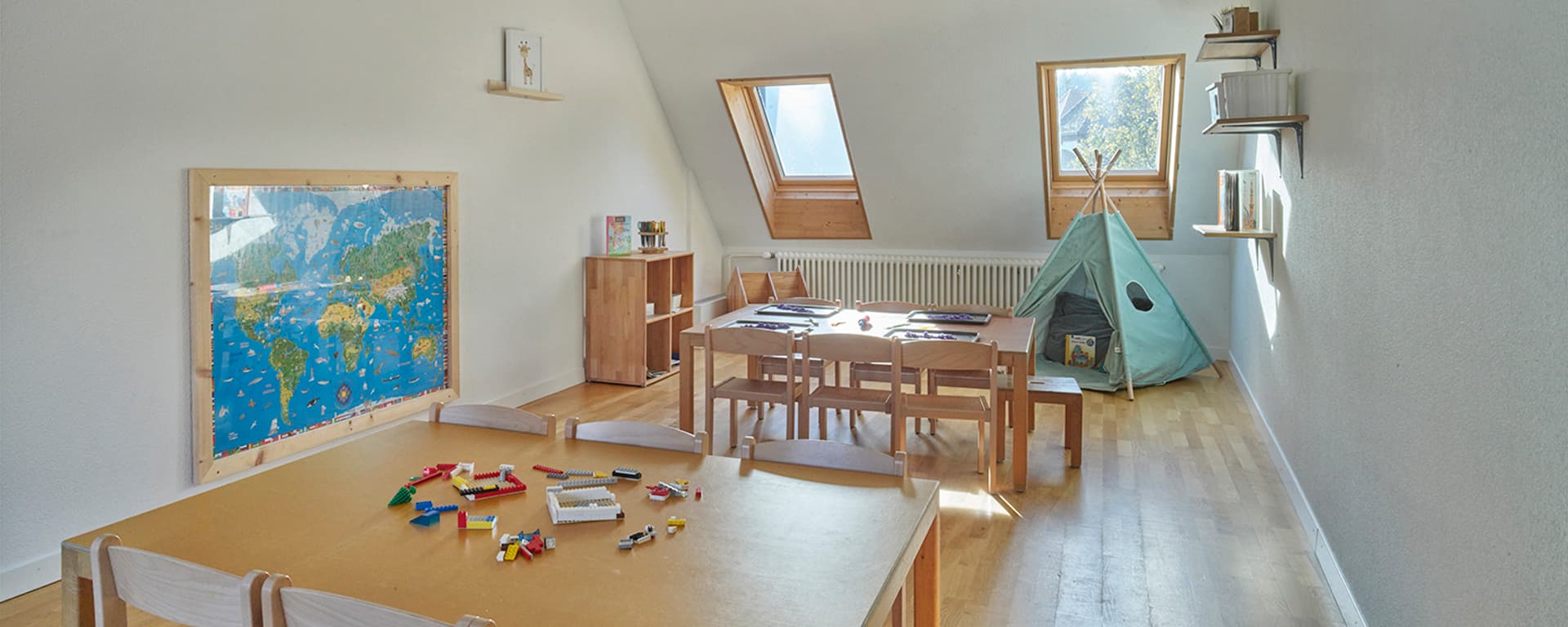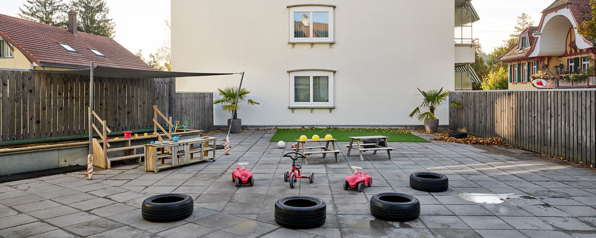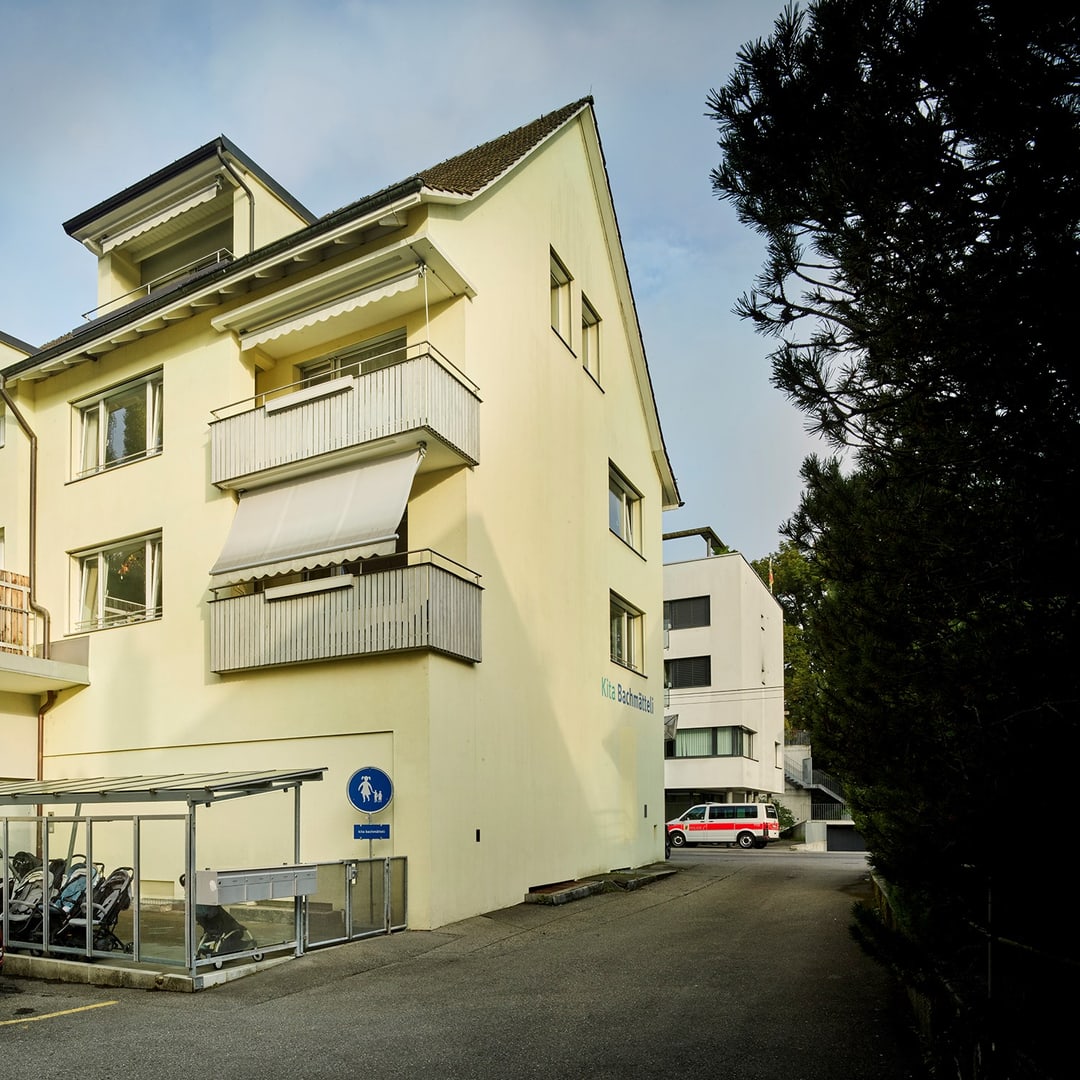 L'ampio spazio esterno viene regolarmente utilizzato per giocare a calcio o fare giri in monopattino. L'ampio interno dell'ex edificio della polizia offre spazio a quattro gruppi di bambini. Oltre alle aree fisse per mangiare e dormire, i bambini possono sperimentare tutti i loro sensi nelle aule didattiche con una parete da arrampicata, nell'atelier, nelle stanze per i giochi di ruolo o persino in un angolo ufficio. All'asilo Bachmätteli, che nel 2025 festeggerà il suo quindicesimo anniversario, i bambini di diverse nazioni si ritrovano in un'atmosfera familiare e premurosa. E quando i bambini non giocano nell'angolo delle auto, possono osservare vere auto della polizia nella stazione di polizia sul lato opposto della strada.