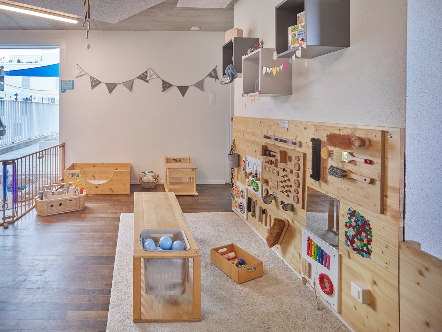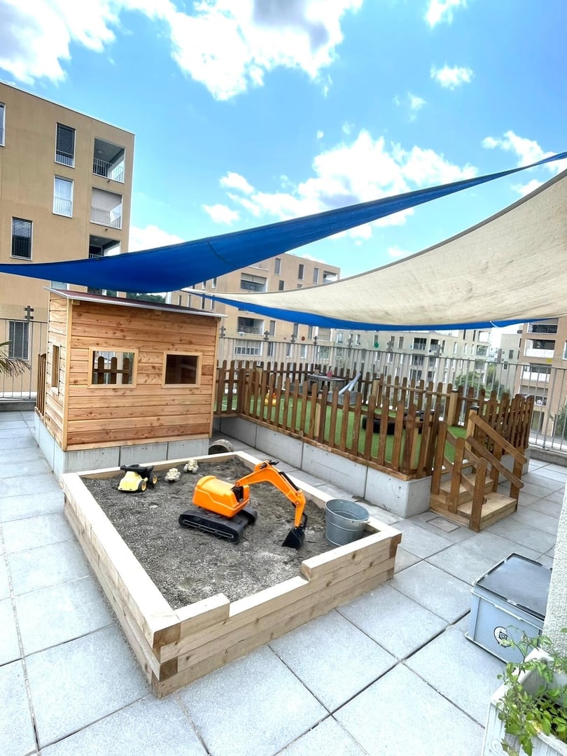 L'asilo nido, facilmente raggiungibile in auto e con i mezzi pubblici, occupa due piani, entrambi progettati pensando ai bambini e agli asili nido. I bambini sono seguiti in tre fasce d'età. Le stanze sono luminose e invitanti grazie alle finestre a tutta altezza. C'è un accogliente angolo dei libri, una stanza per i giochi di ruolo, una stanza per il movimento, uno studio, una stanza per la musica e un angolo per gli esperimenti. Dalle stanze del gruppo dei bambini al piano superiore si accede alle terrazze dell'asilo con una grande sabbiera e zone d'ombra. La terrazza è stata ridisegnata dal nostro team di artigiani nell'estate del 2024. I bambini dell'asilo si divertono spesso a trascorrere il tempo all'aperto e a scoprire la natura.