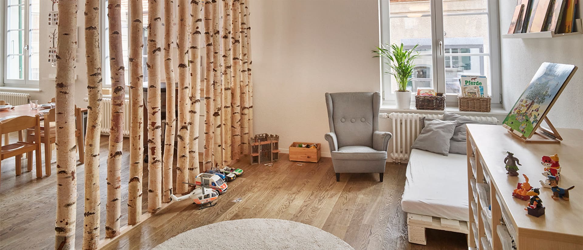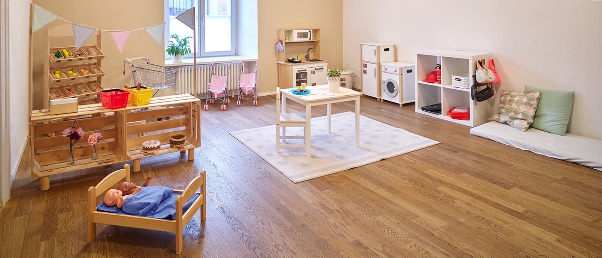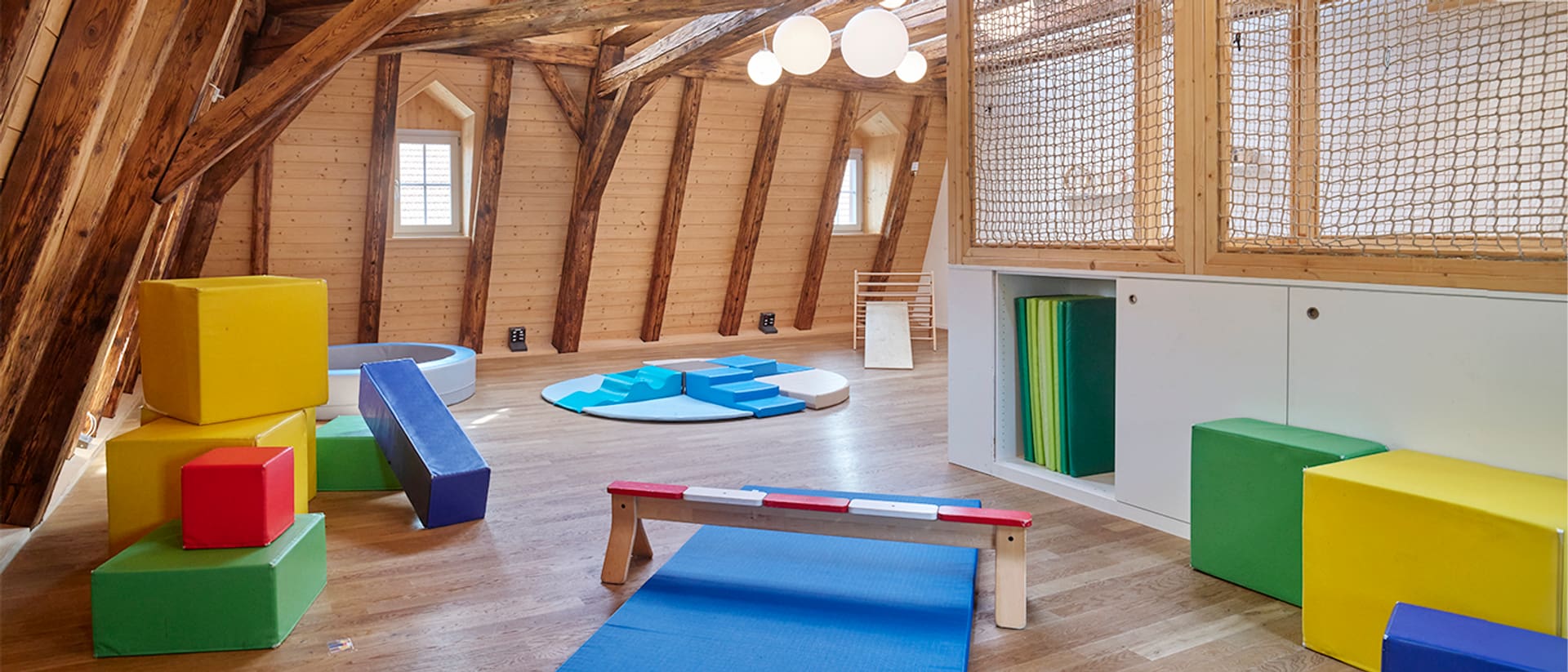 Corridoi tortuosi, nicchie nascoste, una porta qui, un'altra stanza là. Grazie all'armonia dei colori, ci si sente subito a casa. L'edificio, classificato come patrimonio storico, è stato ristrutturato e rimodellato nel 2012 per renderlo adatto ai bambini e agli asili nido. Su tre piani c'è spazio per tre fasce d'età. Il fulcro è l'ampia e versatile stanza in mansarda, dove i bambini possono dare libero sfogo alla loro voglia di muoversi. All'esterno c'è un giardino privato con una grande sabbiera con collegamento all'acqua. La grande terrazza coperta con la nave dei pirati offre spazio per giochi di ruolo e passeggiate in bicicletta. Grazie alla sua posizione centrale, l'asilo è facilmente raggiungibile a piedi, con i mezzi pubblici o in auto.
