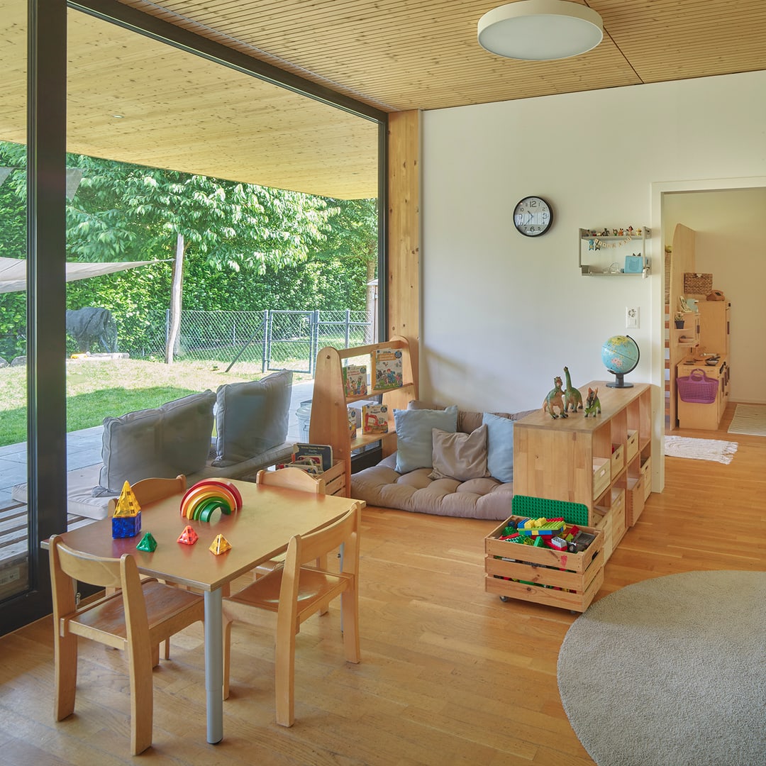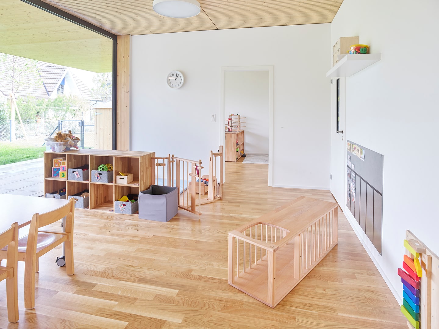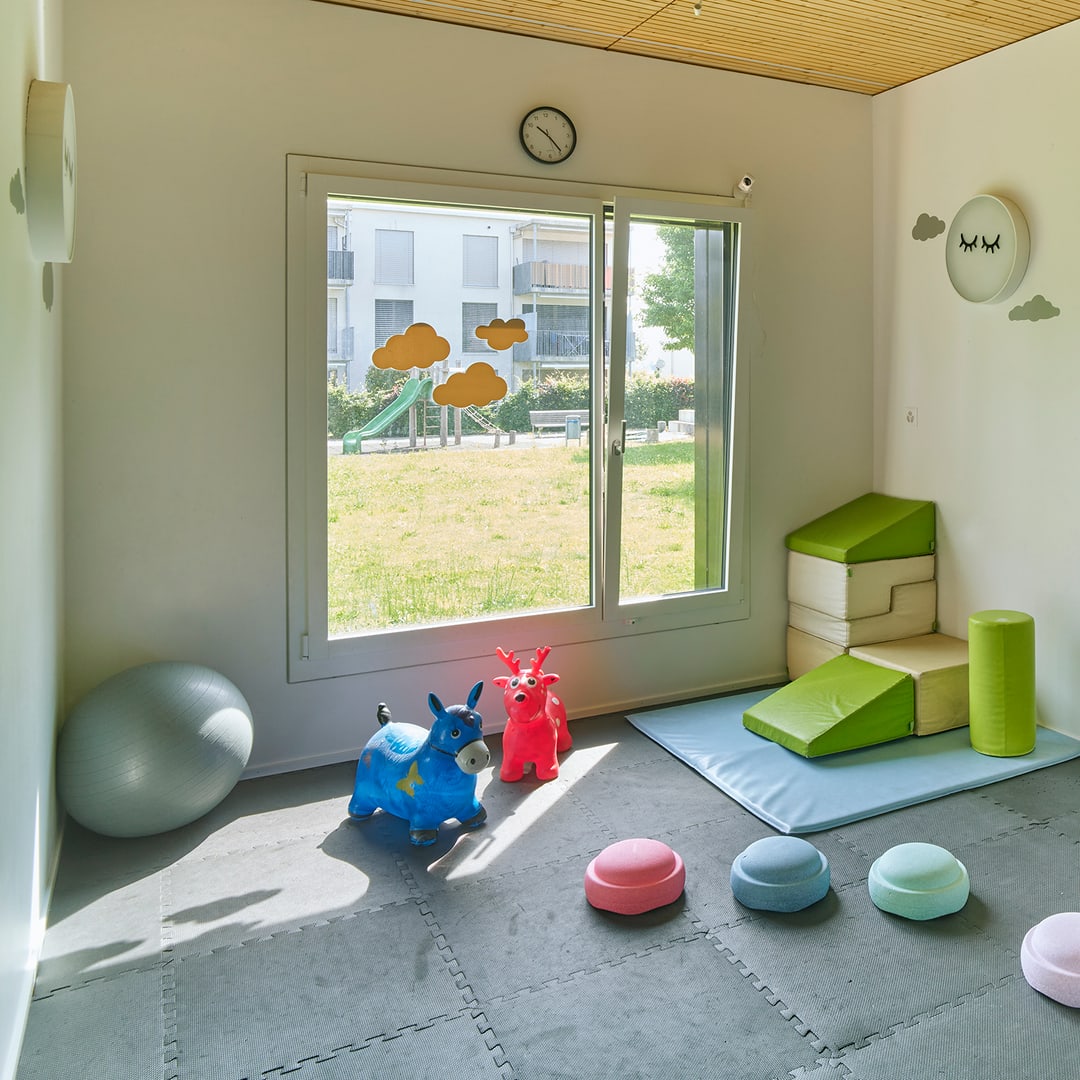 In ogni caso, l'edificio costruito come asilo nido non può essere trascurato. Si trova in posizione tranquilla nel cortile interno del nuovo complesso residenziale Stockfeld di Aegerten ed è facilmente raggiungibile in auto e con i mezzi pubblici, sia da Bienne che da Lyss. I bambini sono accolti in due gruppi separati per età e dispongono di ampi spazi per svilupparsi. C'è un'area protetta per i più piccoli, una stanza per il movimento e una per le costruzioni per i più grandi, oltre a una stanza per i giochi di ruolo. Gli ambienti sono luminosi, aperti e a misura di bambino. Il grande prato del giardino dell'asilo è attrezzato con una sabbiera, una casetta e una tenda da sole. Proprio accanto all'edificio, i bambini hanno accesso al parco giochi del quartiere con scivolo e torre di arrampicata. Di tanto in tanto, l'asilo di Stockfeld fa una gita nel vicino prato per osservare i cavalli.