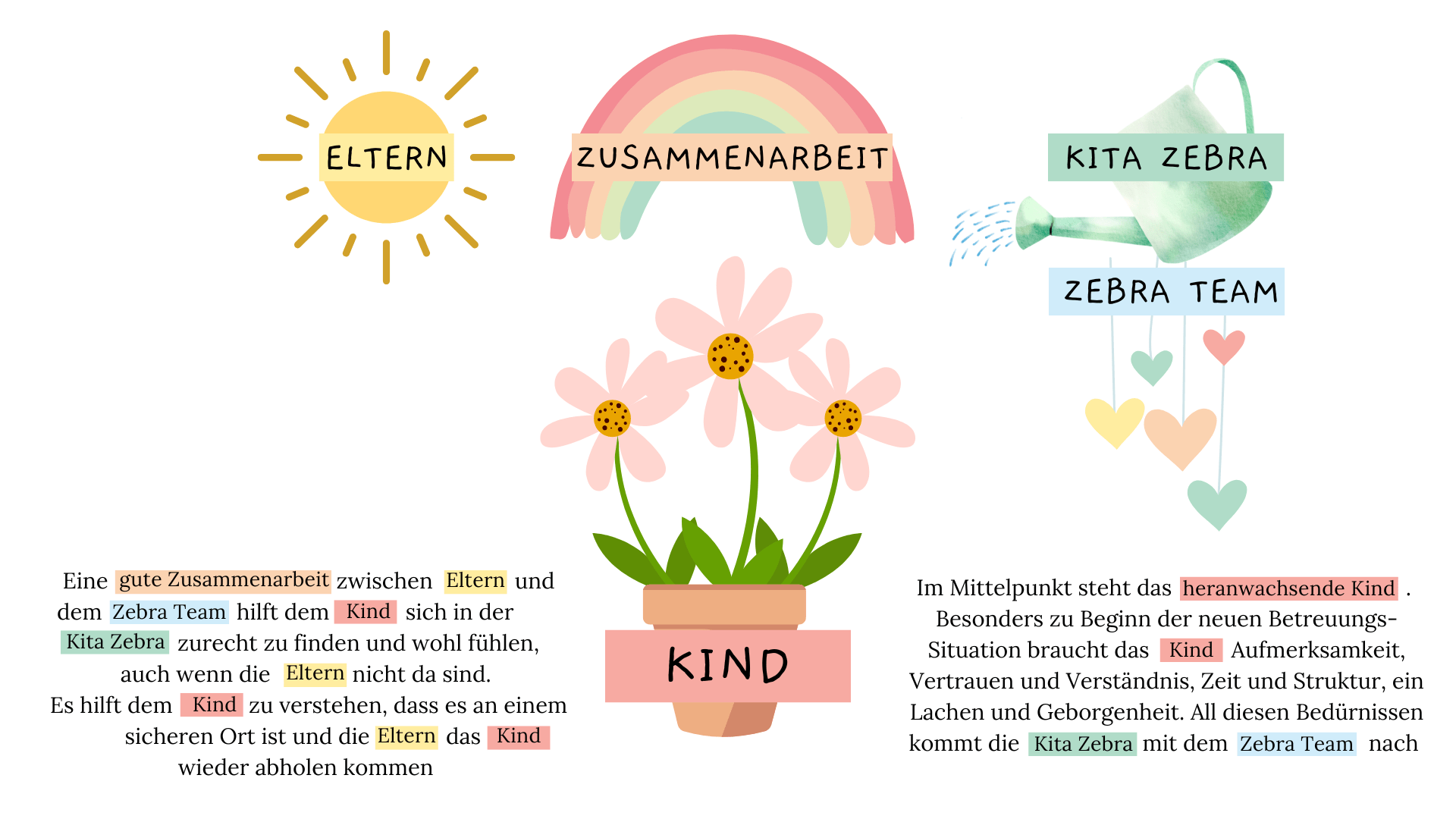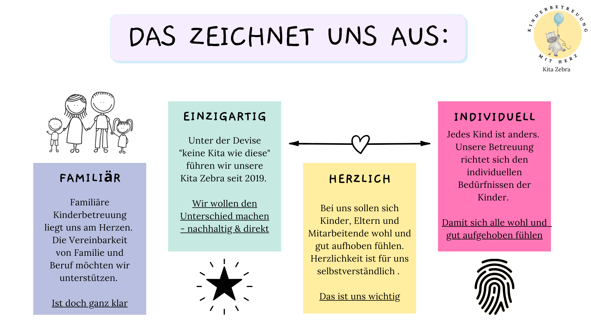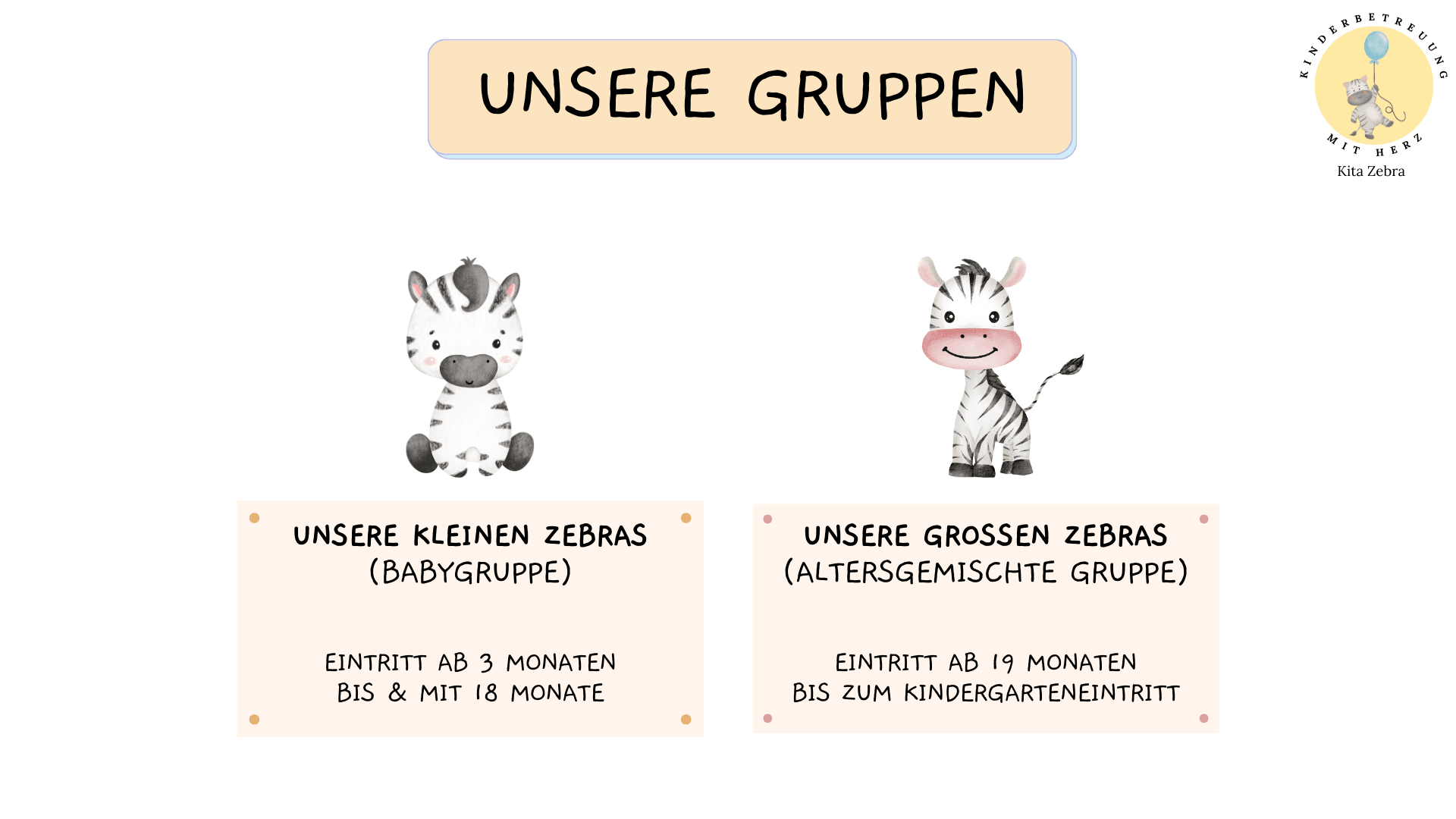 Kita Zebra offre un'assistenza professionale ai bambini al di fuori della famiglia. Ci occupiamo di bambini dai 3 mesi all'età della scuola materna, suddivisi in due gruppi.